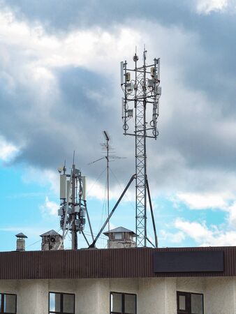 テレビ局やラジオのマストとテレビ塔 電話を波や無線ネットワークを介して通信用アンテナ 放送情報通信のための送信機のイラスト素材 ベクタ Image